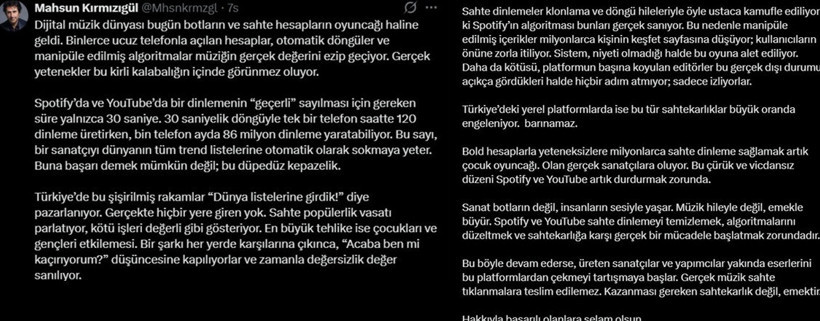 Sanat botların değil, insanların sesiyle yaşar; müzik hileyle değil, emekle büyür. Spotify ve YouTube sahte dinlemeyi temizlemek, algoritmalarını düzeltmek ve sahtekârlığa karşı gerçek bir mücadele başlatmakla yükümlü. Bu böyle devam ederse üreten sanatçılar ve yapımcılar yakında eserlerini bu platformlardan çekmeyi tartışmaya başlar. Gerçek müzik sahte tıklanmalara teslim edilemez; kazanması gereken sahtekârlık değil, emektir. Hakkıyla başarılı olanlara selam olsun.”