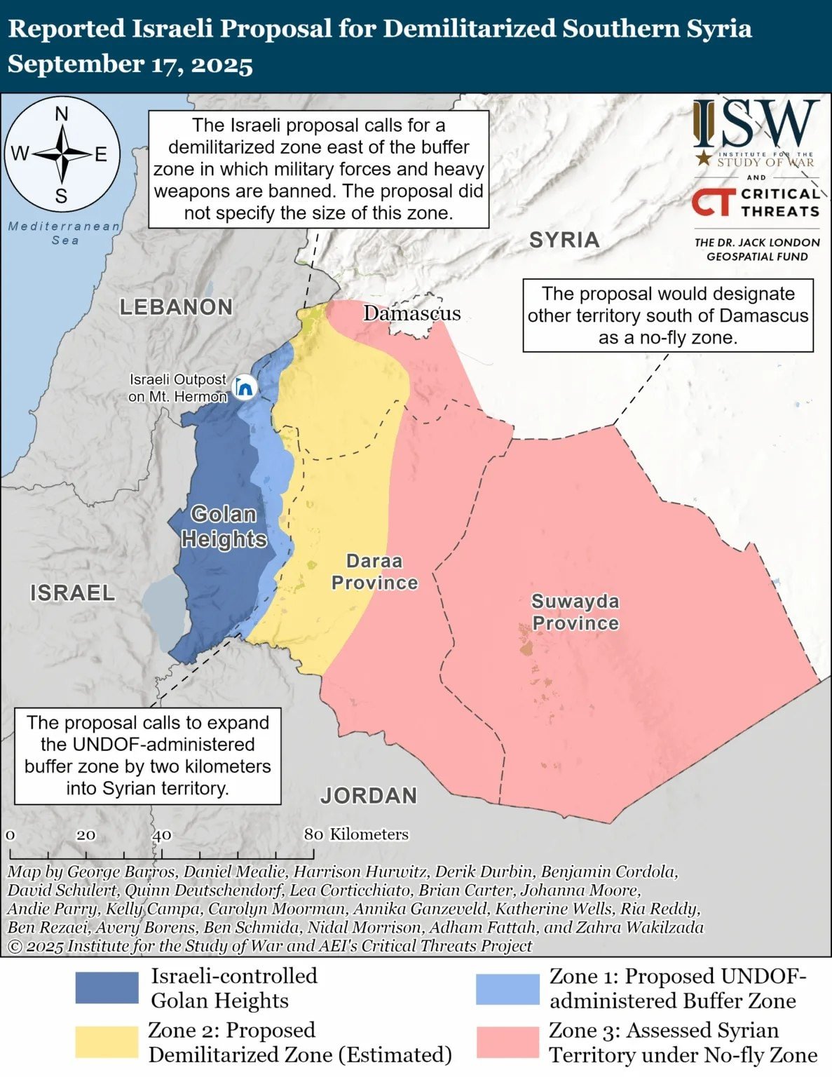 Öneri, UNDOF yönetimindeki tampon bölgenin Suriye topraklarına doğru iki kilometre genişletilmesini ve Şam’ın güneyindeki diğer bölgelerin uçuşa yasak bölge olarak belirlenmesini talep ediyor. Bu harita, İsrail ayrıca Golan Tepeleri’nin tamamına sahip oluyor.